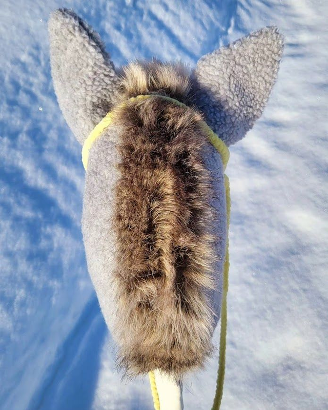 Gray teddy hobby donkey with a gray fur mane and tail.