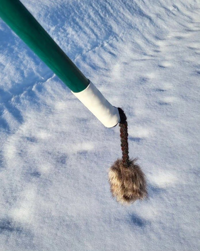 The base of the tail and the stick's opening are finished with heat-shrink tubing.