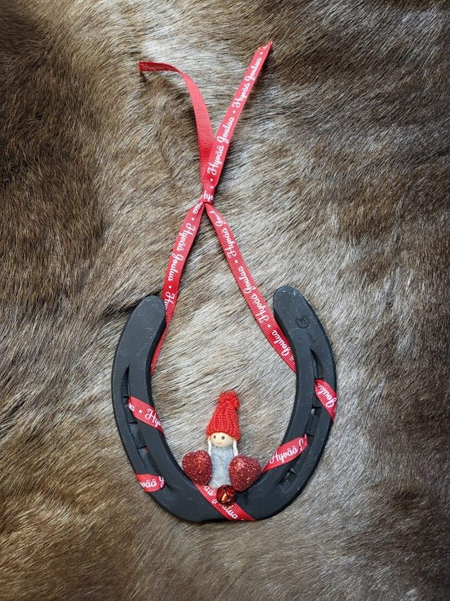 Hevosenkenkään tehty joulukoriste. Voit ripustaa sen roikkumaan esim. oveen tai seinälle.