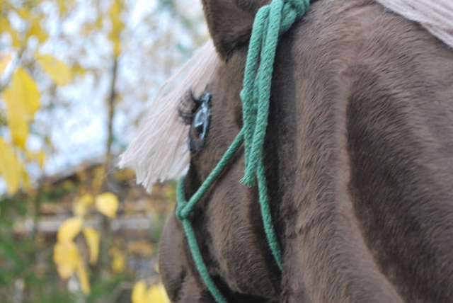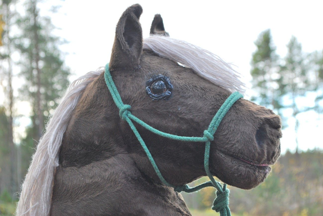 Rope halter with a lead rope is included in the price. Large hobby horse with glass eyes and eyelashes, weighing approx. 500g.