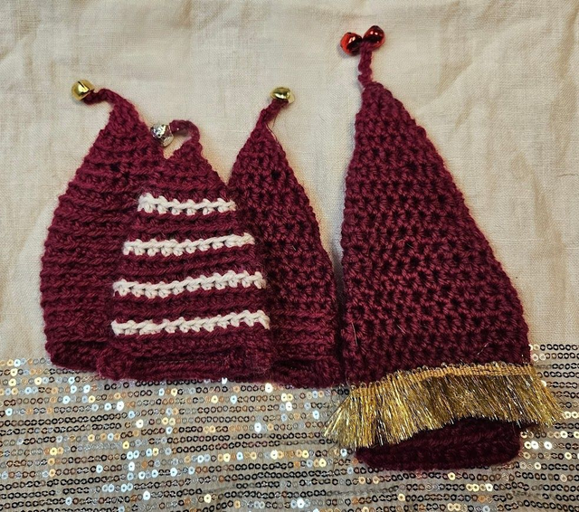 Crocheted hobby horse Santa hat made from leftover yarn. Dark red, approx. 14 cm long, for a large ear, such as a donkey's.