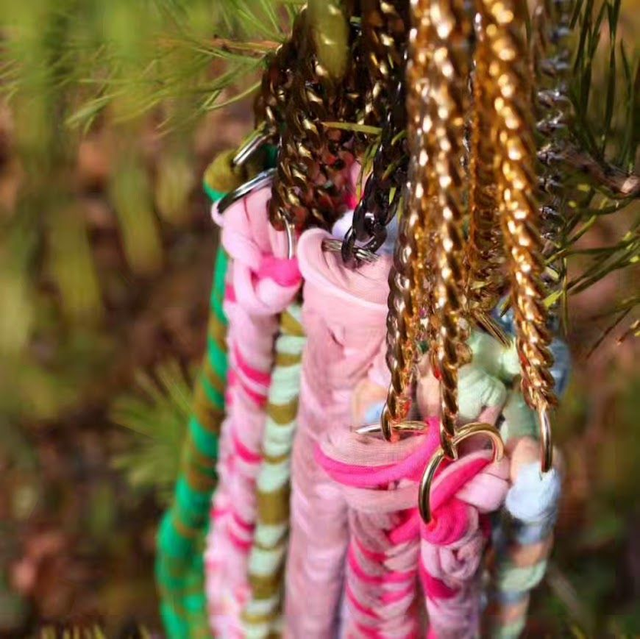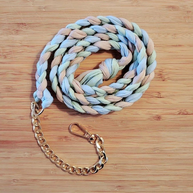 The total length of the chain and clasp is approximately 19 cm, and the chain color varies. The rope part is made from leftover rug yarn.
