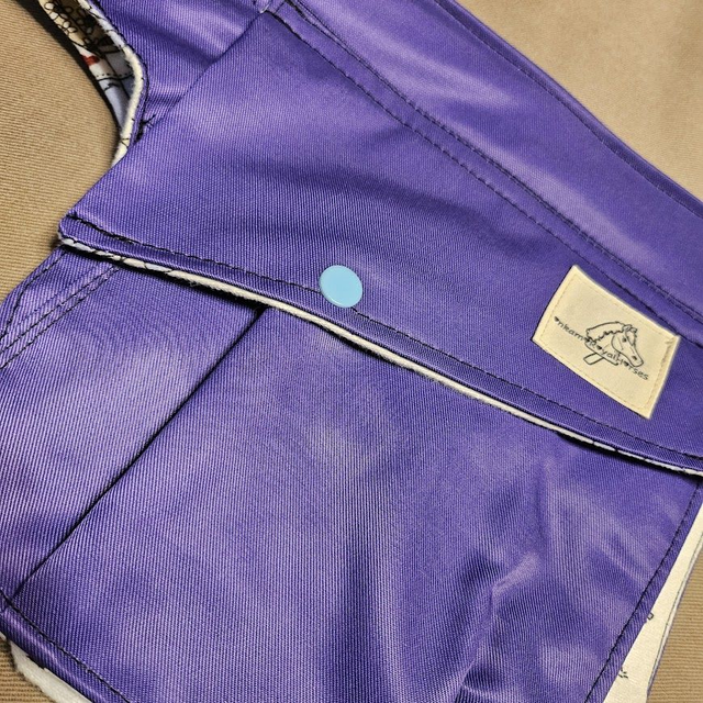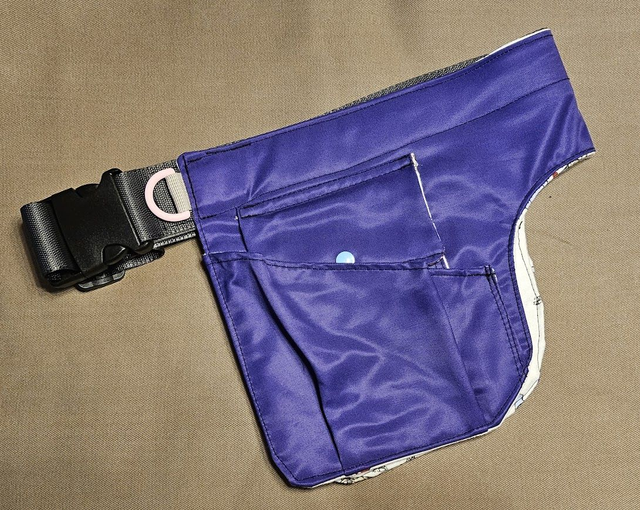 Purple Enstex fabric with a fun flannel bear lining. The D-ring is a 3D-printed pink one.