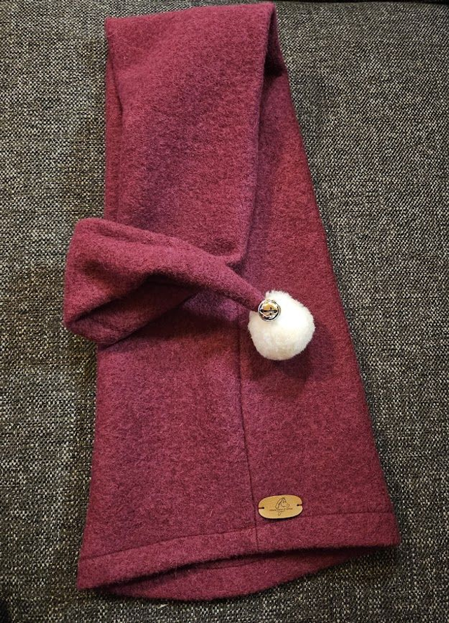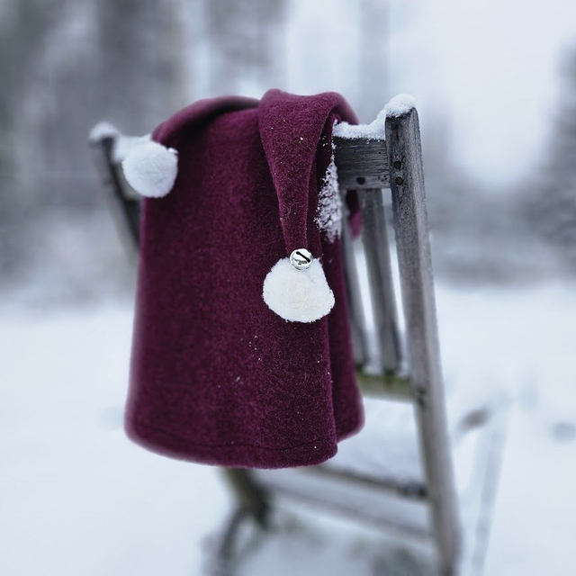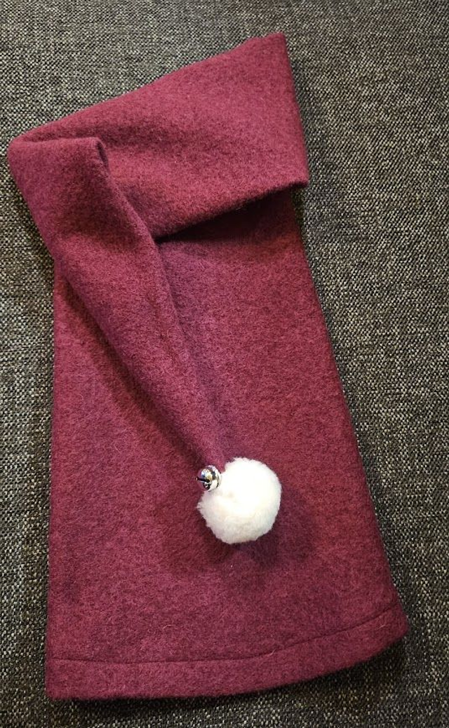 Long Santa Hat (Burgundy )Made from high-quality 100% sheep’s wool with a bouclé texture. The fabric is Mulesing-free and Oeko-Tex certified. Finished with a teddy fabric pom-pom and a silver jingle bell at the tip.