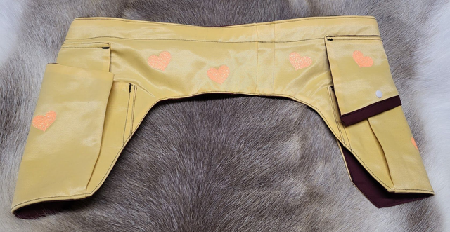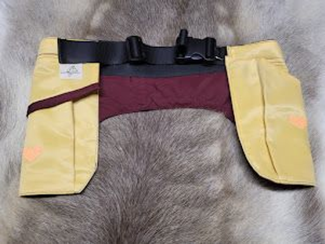 Tämä malli keltaista enstexiä, viininpunaisella vuorikankaalla. Koko L (vyötärö 90-124cm).