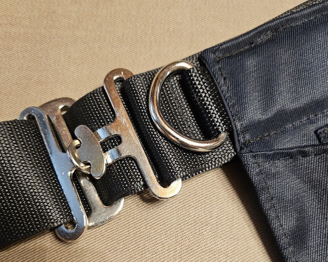 The trainingbelt is crafted from industrial surplus fabrics and a repurposed seatbelt.