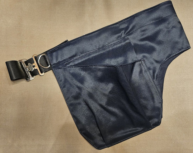 Koko S (vyötärö 78-104 cm). Vyötärö kiinnittyy loimilukolla, kierrätetty hevosten loimista.