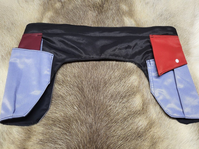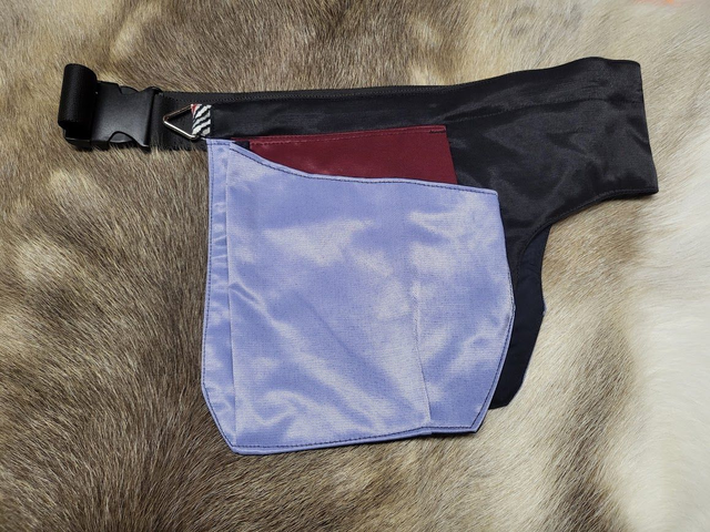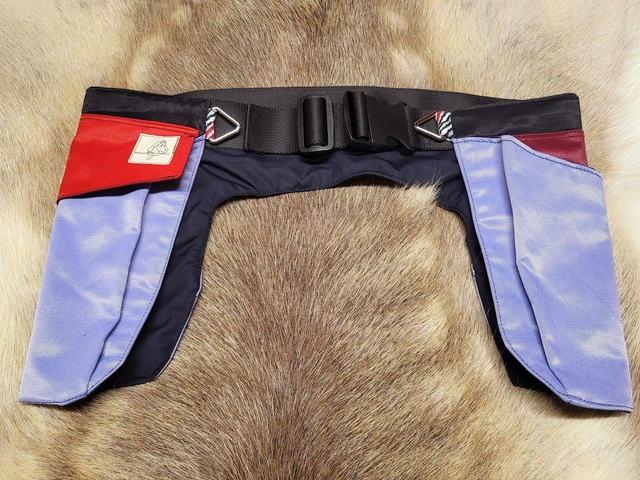 D-lenkki korvattu kolmion mallisella lenkillä ja kiinnityksessä käytetty raidallista vinonauhaa. Koko M/L (vyötärön säätövara 94-107cm).